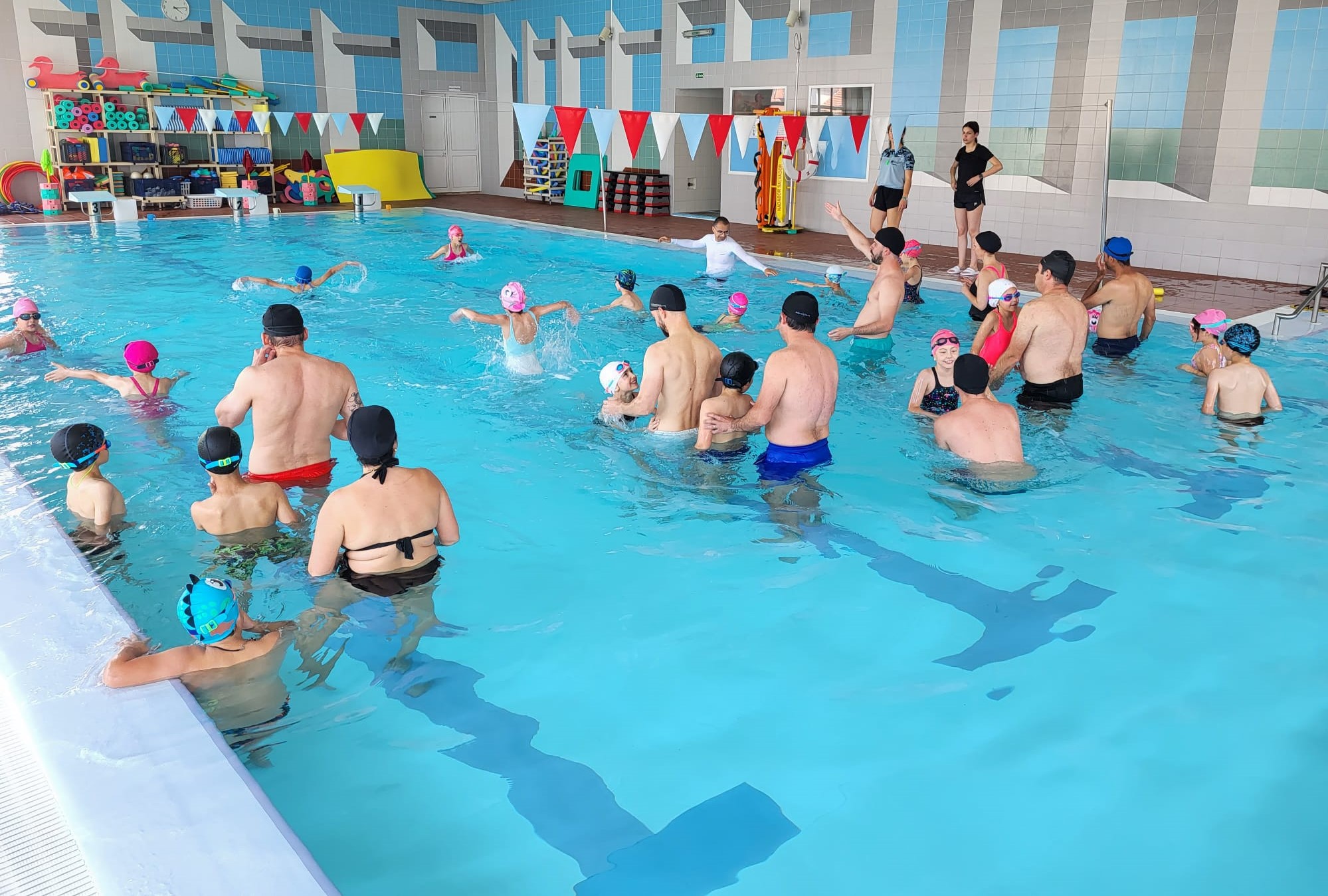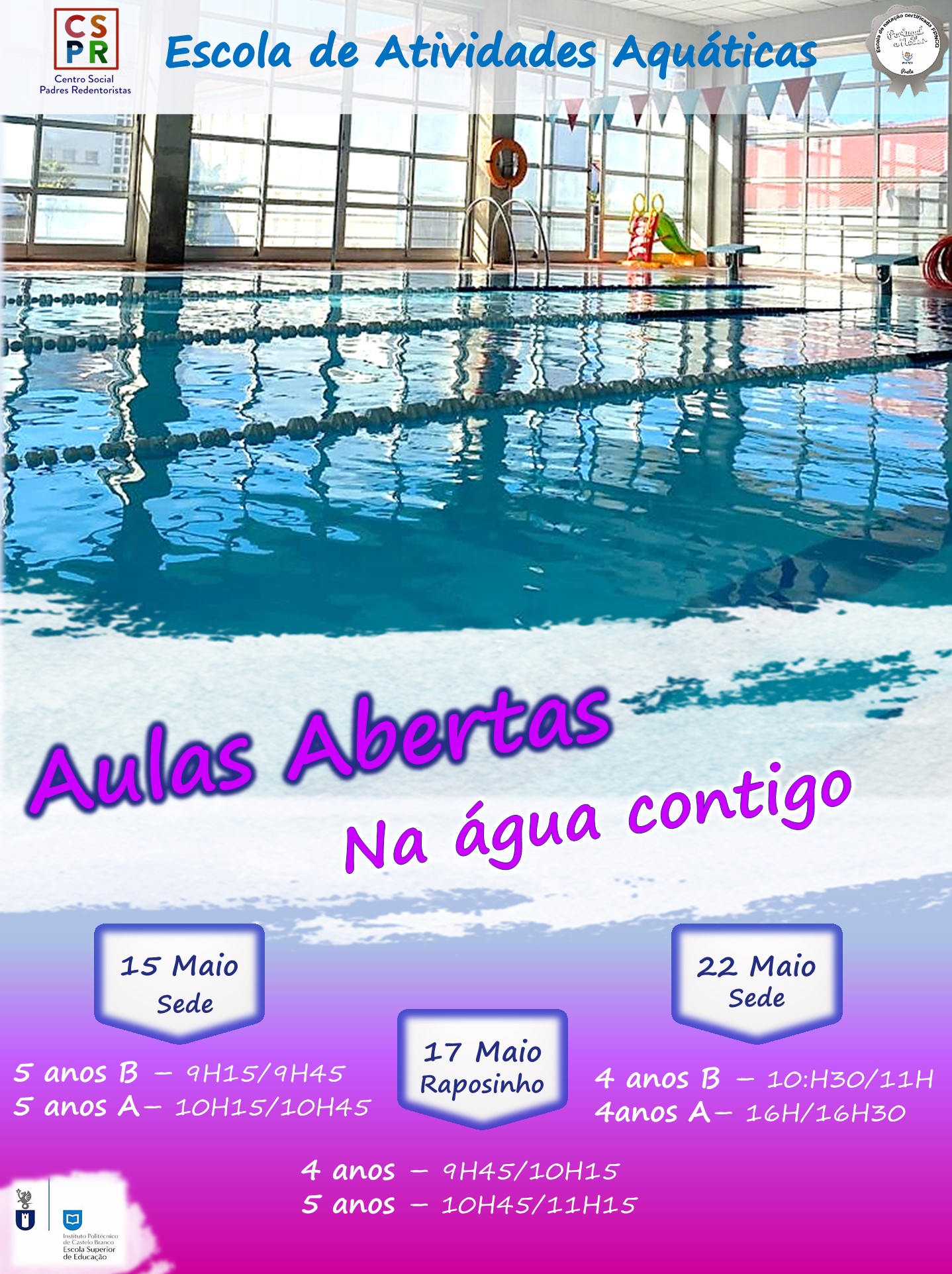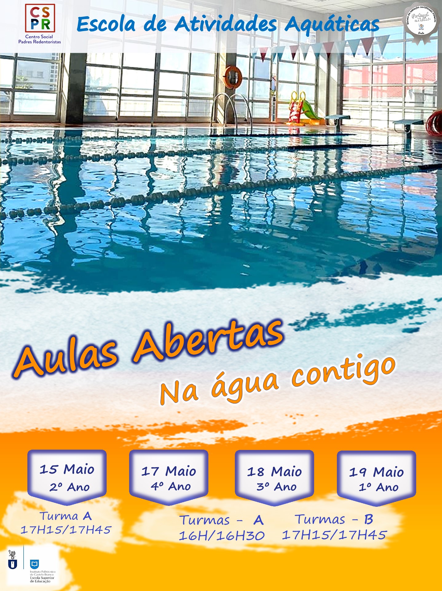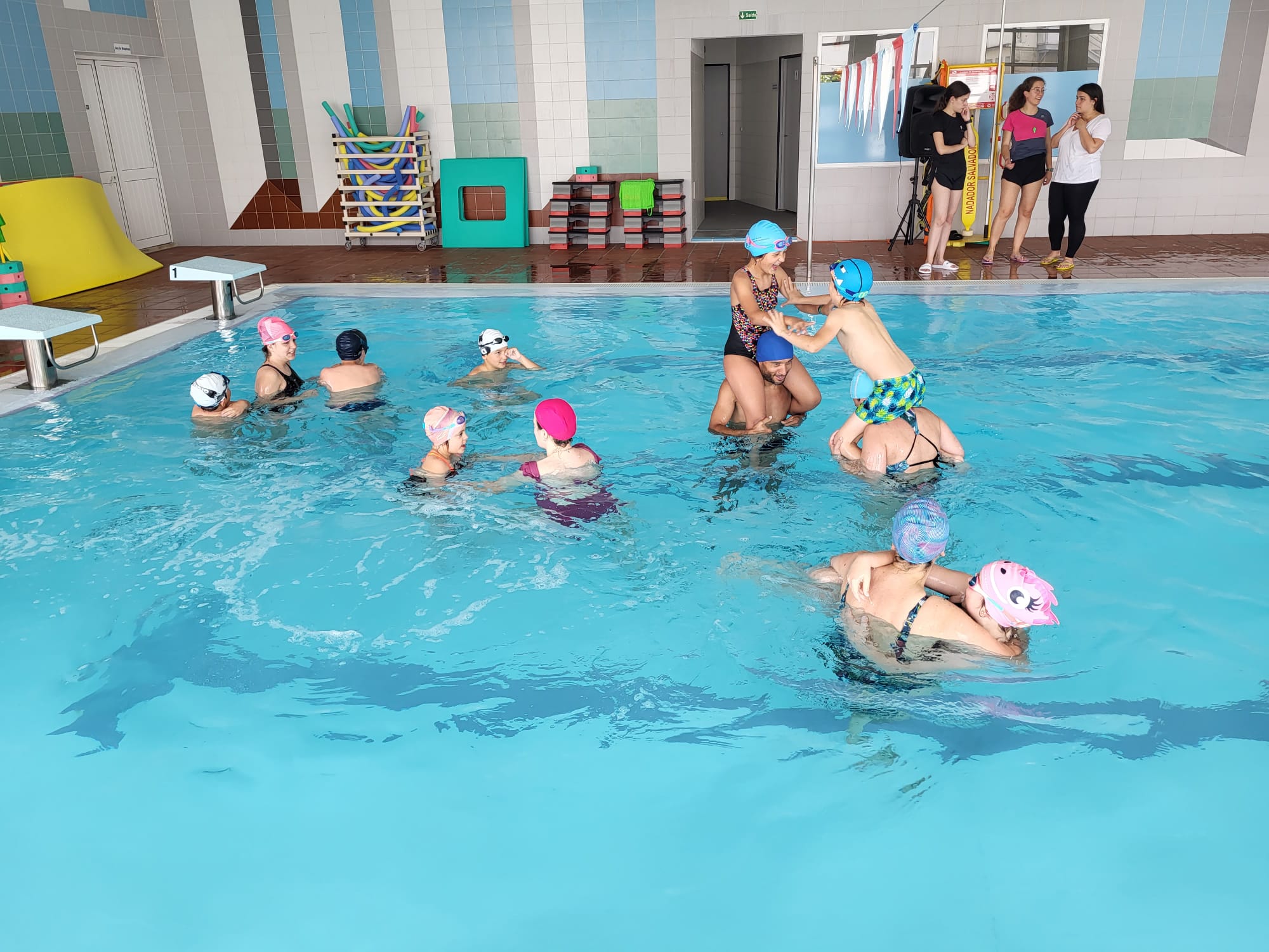 Esta atividade foi dirigida aos alunos do pré-escolar e 1º Ciclo da nossa instituição, em que o principal objetivo foi trazer o maior número de pais a participar na aula de natação junto dos seus filhos. Este objetivo foi largamente atingido, tendo trazido momentos de muito convívio, alegria, interação e muita cumplicidade entre os intervenientes.